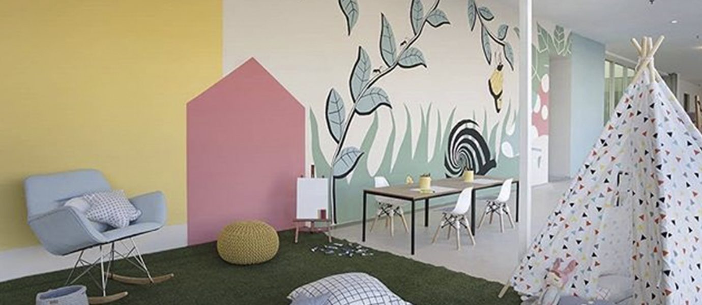 Trazendo esse mundo de descoberta através da interatividade, das cores, com a pintura de desenho especial na parede e a reutilização de materias. Muitas latas de tintas foram usadas de forma criativa nesse espaço, e é claro, nós adoramos!